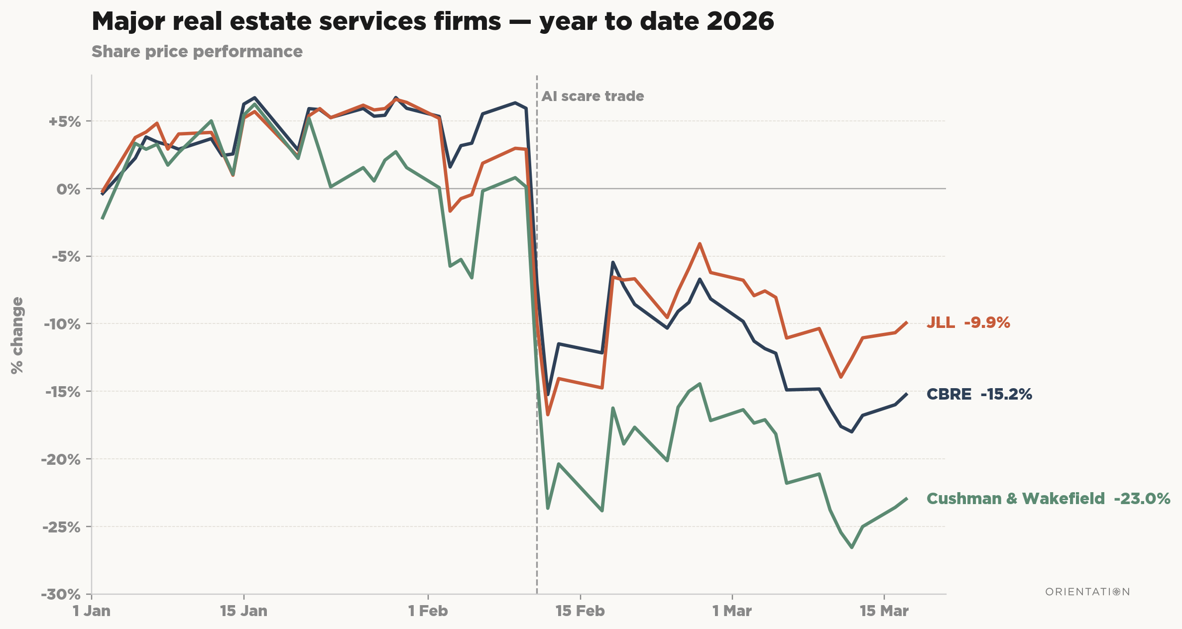 First, AI may disrupt real estate businesses directly. Unlike software, however, these firms are in the business of physical assets. This points to more pervasive fears that parts of the real estate market are vulnerable to AI’s secondary effects.