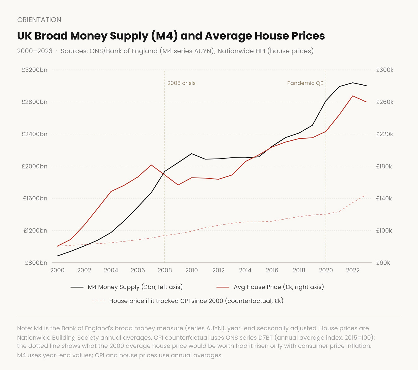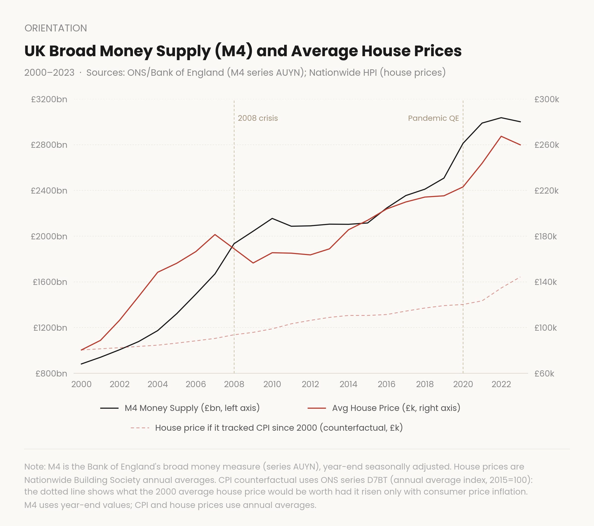 We don’t build enough housing in the UK. It’s a scarce asset, which is why, when the money supply expands, it shows up on Rightmove, and in how hard it is to get a foot on the ladder.