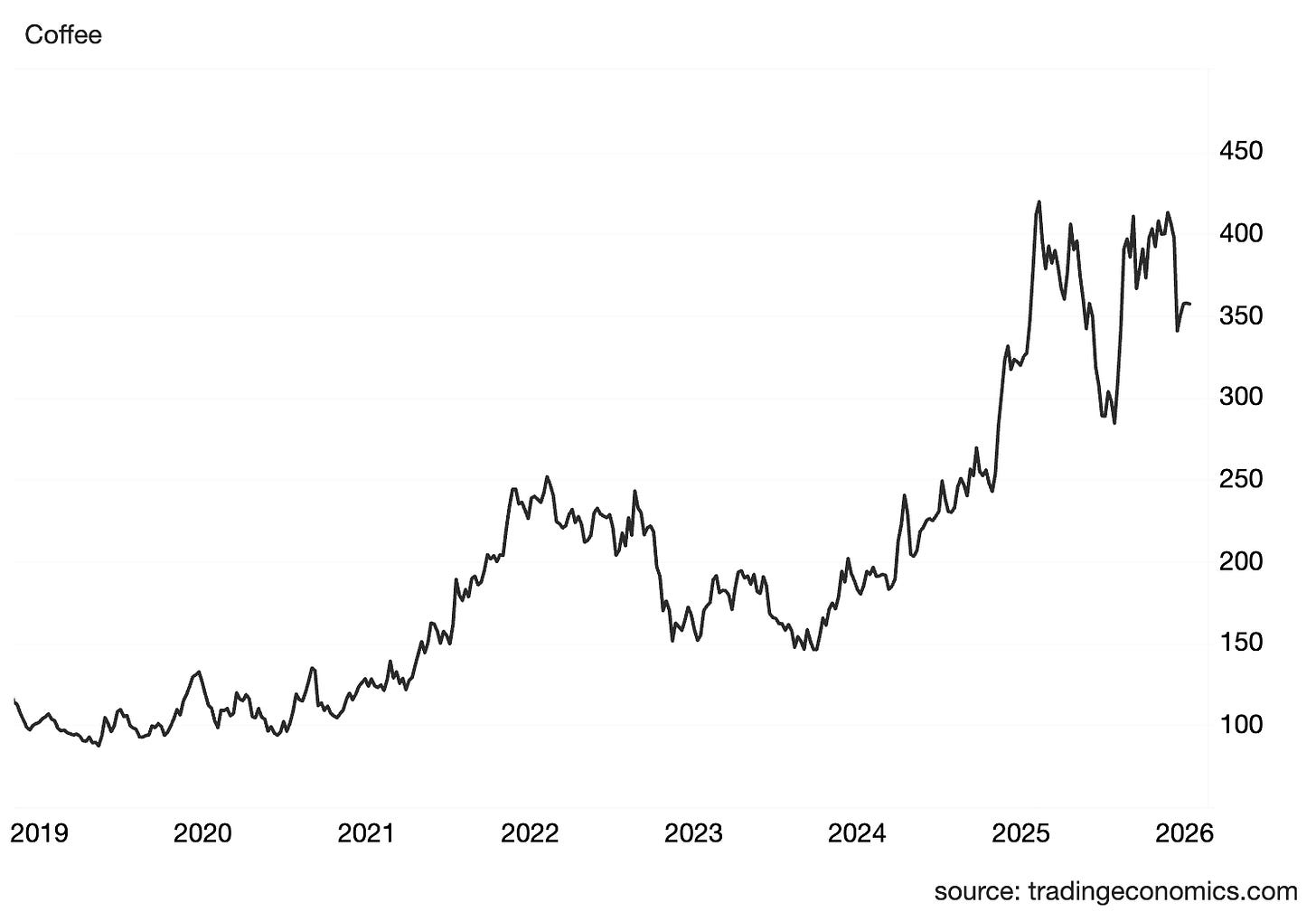 Raw materials show similar upward pressure: global coffee bean prices, for example, reached near multi-decade highs in recent years.
