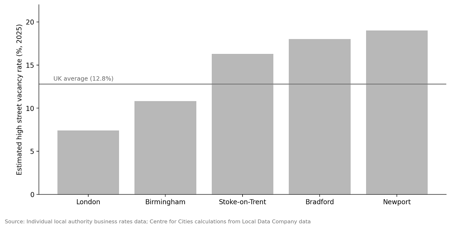 Using the most recent data available, Centre for Cities shows that in places like Newport, Bradford, or Stoke, vacancy rates sit close to 20% - meaning one in five shopfronts stands empty.