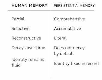 A system designed and incentivised to retain information indefinitely does not forget in the way humans do. It does not prioritise, reinterpret, or wane with time. Memory, in this case, is not shaped by limitation.